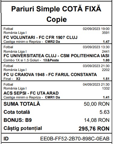 Am extras cele mai „safe” variante de profit de la partidele programate, rezultând un „combo” în cota totală de 5.63. Vom încerca să ne rotunjim veniturile mizând pe favoriți.