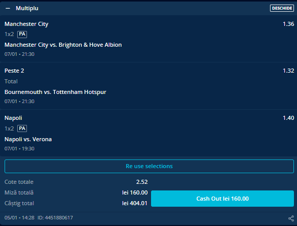 Pariurile lui Sabin (07.01) – Lucrurile s-au legat bine în finalul lui 2025 și în startul noului an, ultimele două bilete pe care vi le-am propus fiind ”verzi”. Astăzi țintim un nou bilet de pariuri câștigător, cu ponturi pariuri Premier Leaggue și Serie A.