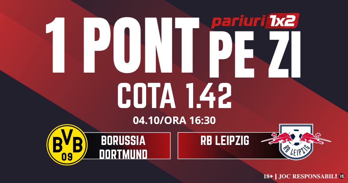 Pentru rubrica Un Pont pe Zi mergem la meciul dintre Borussia Dortmund și RB Leipzig, partidă contând pentru etapa cu numărul șase din Bundeslulga. Duelul dintre cele două formații va avea loc pe Signal Iduna Park, începând cu ora 16.30. Gazdele vin după o victorie în Liga Campionilor, 4-1 cu Atletic Bilbao, în cea de-a doua rundă a competiției. În Bundesliga, BVB merge foarte bine, patru victorii și o remiză în cele cinci partide disputate. De partea cealaltă, Leipzig are patru victorii consecutive în primul eșalon al fotbalului german. Ne așteptăm la un meci deschis între două formații bune ale campionatului, iar pronosticul nostru este „ambele înscriu”.