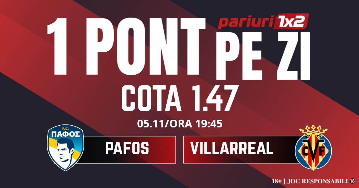 Pentru rubrica Un Pont pe Zi mergem la meciul dintre Pafos și Villarreal, partidă contând pentru etapa cu numărul patru din Liga Campionilor. Duelul dintre cele două formații va avea loc pe Alphamega Stadium din Limassol, începând cu ora 19.45. Gazdele deja și-au depășit condiția după ce s-au calificat în grupele celei mai puternice competiții din lume. mai mult, ciprioții au acumulat și două puncte în cele trei runde după cele două remize identice, 0-0 la Olympiacos și Kairat Almati. În singurul test adevărat, în fața unei echipe foarte puternice, cei de la Pafos au cedat, 1-5 cu Bayern Munchen. Oaspeții trec printr-o perioadă foarte bună, având trei victorii consecutive. În schimb, în Liga Campionilor nu au decât un punct acumulat, astfel că „submarinul galben” nu are voie să facă nici un pas greșit în acest meci. Diferența de valoare este destul de mare între cele două formații, iar pronosticul nostru este Villarreal câștigă.
