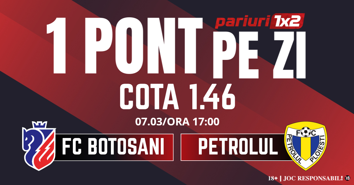 Pentru rubrica Un Pont pe Zi mergem la meciul dintre FC Botoșani – Petrolul, partidă contând pentru etapa cu numărul 30 din Superliga. Duelul dintre cele două formații va avea loc pe Stadionul Municipal Botoșani, începând cu ora 17.00. Gazdele au pierdut matematic runda precedentă calificarea în play off, iar antrenorul Leo Grozavu a fost demis de la cârma moldovenilor. Botoșănenii au nevoie de un nou moment zero, fiind în play out se anunță vremuri grele, lupta pentru evitarea retrogradării fiind dramatică. Petrolul este pe loc de baraj și are de asemenea nevoie de cele trei puncte pentru a ține aproape de restul formațiilor. Oaspeții formează un grup unit care primește greu gol, dar înscriu și foarte puțin. Elevii lui Eugen Neagoe are cel mai slab atac din Superliga, 23 de goluri înscrise. Mizăm pe gazde în această confruntare, iar pronosticul nostru este 1x și 1-5 goluri.