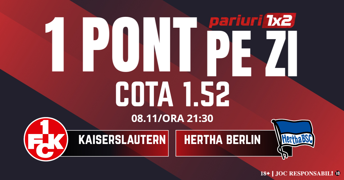 Pentru rubrica Un Pont pe Zi mergem la meciul dintre Kaiserslautern și Hertha Berlin, partidă contând pentru etapa cu numărul 12 din Zweite Bundesliga, al doilea eșalon al fotbalului românesc. Duelul dintre cele două formații va avea loc pe Fritz Walter Stadion începând cu ora 21.30. Gazdele se află pe locul șase cu 20 de puncte, la doar trei lungimi de ultima treaptă a podiumului. Chiar dacă lupta pentru promovare este incredibil de dificilă, fanii formației speră la revenirea în Bundesliga după 14 ani. Pe teren propriu, diavolii roșii sunt o forță, patru victorii și o remiză în cinci meciuri. De partea cealaltă, Hertha își dorește și ea promovarea dar a strâns doar 17 puncte. O formație inconstantă în evoluții, dar cu o formă bună, patru victorii și un eșec în precedentele cinci etape disputate. Mizăm pe un meci echilibrat în care gazdele de pe Fritz Walter Stadion nu vor pierde totuși această partidă.