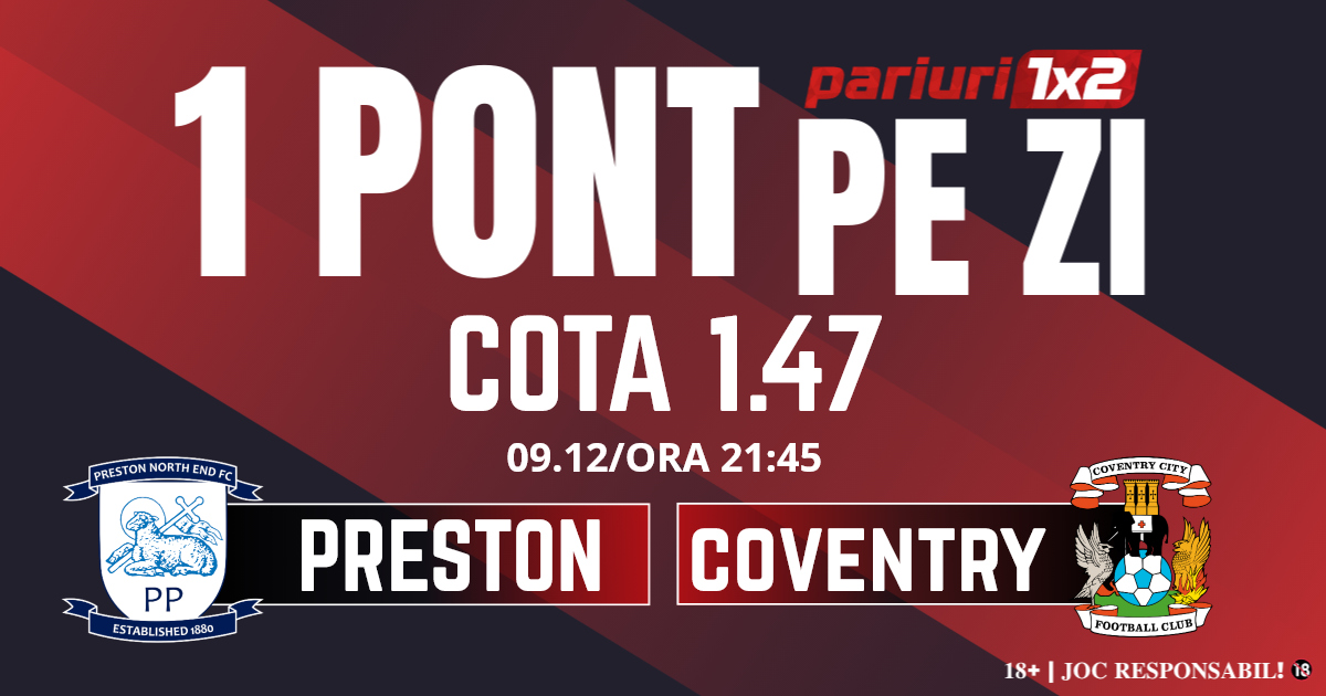 Pentru rubrica Un Pont pe Zi mergem la meciul dintre Preston și Coventry, partidă contând pentru etapa cu numărul 20 din Championshiop, al doilea eșalon al fotbalului englez. Duelul dintre cele două formații va avea loc pe Deepdale din Preston, începând cu ora 21.45. Gazdele se află pe locul cinci cu 31 de puncte acumulate și obiectivul este unul clar, cel puțin o poziție de play off la finalul sezonului. În cele 19 partide disputate, Preston are doar patru înfrângeri, iar în precedentele cinci partide de campionat au pierdut pe teren propriu doar cu Blakcburn. De partea cealaltă, oaspeții sunt pe primul loc al clasamentului cu 43 de puncte acumulate, iar în acest ritm Coventry va reveni în premier League după o pauză foarte lungă. Gruparea vizitatoare are doar două eșecuri, unul runda precedenteă, 0-3 pe terenul celor de la Ipswich, dar lucrul acest poate fi considerat un accident. Atacul merge foarte bine, 50 de goluri marcate, iar defensiva a fost depăsită de doar 21 de ori. Mizăm pe un meci în care oaspeții nu vor pierde, iar pronosticul nostru este x2 și sub 4.5 goluri.