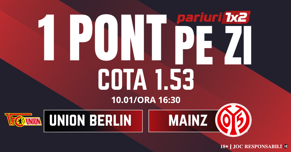 Pentru rubrica Un Pont pe Zi mergem la meciul dintre Union Berlin și Mainz, partidă contând pentru etapa cu numărul 16 din Bundesliga. Duelul dintre cele două echipa va avea loc pe Stadion An der Alten Försterei din Berlin, începând cu ora 16.30. Gazdele fac un sezon foarte bun, fiind clasate pe locul 8 cu 21 de puncte acumulate. Gruparea din capitala Germaniei este una dintre puținele formații care au reușit să smulgă un punct celor de la Bayern Munchen. Pe teren propriu, berlinezii au doar două înfrângeri în cele 8 partide disputate. De partea cealaltă, oaspeții sunt într-o situație disperată și au nevoie de puncte pentru a ieși din zona roșie. Clasată pe ultimul loc, Mainz este deja la șase lungimi de prima poziție care asigură prezența în Bundesliga, în sezonul viitor. Oaspeții au un singur succes în cele 15 partide disputate, iar în ultimele cinci meciuri jucate pe terenuri adverse au scos doar un punct. Mizăm pe gazde în acest duel, iar pronosticul nostru este 1x și 1-5 goluri.