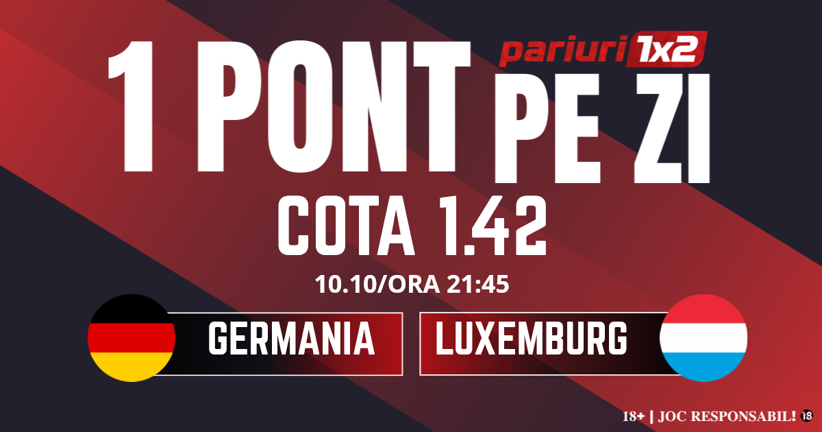 Pentru rubrica Un Pont pe Zi mergem la meciul dintre Germania și Luxemburg, meci contând pentru etapa cu numărul trei din calificările pentru Cupa Mondială. Duelul dintre cele două naționale va avea loc pe PreZero Arena din Sinsheim începând cu ora 21.45. Nemții au nevoie de o victorie în această partidă pentru a nu se depărta de prima poziție a clasamentului. Elevii lui Nagelsmann au deja o înfrângere în preliminarii iar o remiză în această confruntare poate fi fatală. Luxemburg este una dintre cele mai modeste naționale din lume chiar dacă în ultimii ani au mai avut ceva rezultate. Diferența de valoare dintre cele două naționale este mare iar pronosticul nostru este 3-6 goluri.