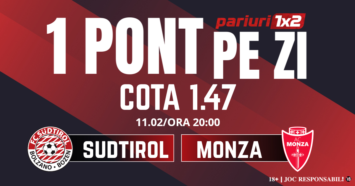 Pentru rubrica Un Pont pe Zi mergem la meciul dintre Sudtirol și Monza, partidă contând pentru etapa cu numărul 24 din Serie B. Duelul dintre cele două formații va avea loc pe Stadio Marco Druso din Bolzano, începând cu ora 20.00. Gazdele sunt pe locul zece cu 29 de puncte acumulate, iar obiectivul principal este menținerea în eșalonul secund al fotbalului din Italia. Sudtirol este într-o formă foarte bună, patru victorii și o remiză în ultimele cinci partide disputate. De partea cealaltă, oaspeții sunt pe poziția secundă a clasamentului și are ocazia, ca în cazul unei victorii, să egalieze liderul Venezia. După retrogradarea din vara trecută se părea că oaspeții nu vor reușit atât de repede să lupte pentru revenirea în Serie A. Monza are doar patru înfrângeri în 23 de partide și merge la Bolzano cu un moral bun dat de situația din clasament. Astfel, pronosticul nostru este x2 și peste 0.5 goluri.