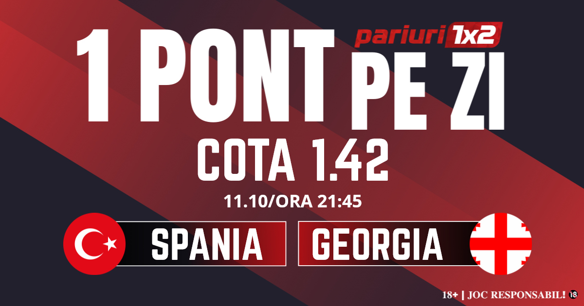 Pentru rubrica Un Pont pe Zi mergem la meciul dintre Spania și Georgia, meci contând pentru etapa cu numărul trei din calificările pentru Cupa Mondială. Duelul dintre cele două formații va avea loc pe Estadio Manuel Martínez Valero din Elche, începând cu ora 21.45. Ibericii au făcut golaveraj în primele două partide disputate în această grupă,0-3 cu Bulgaria și 6-0 cu Turcia. Cu anționala semilunei, Spania a predat o adevărată lecție de fotbal iar calificarea la turneul final din 2026 pare o formalitate. De partea cealaltă, Georgia luptă pentru locul al doilea cu Turcia. Georgienii nu ar spune nu unui punct pe terenul uneia dintre cele mai puternice formații din lume, dar diferența de valoare este foarte mare. Astfel, pronosticul nostru este 1 și peste 2.5 goluri.