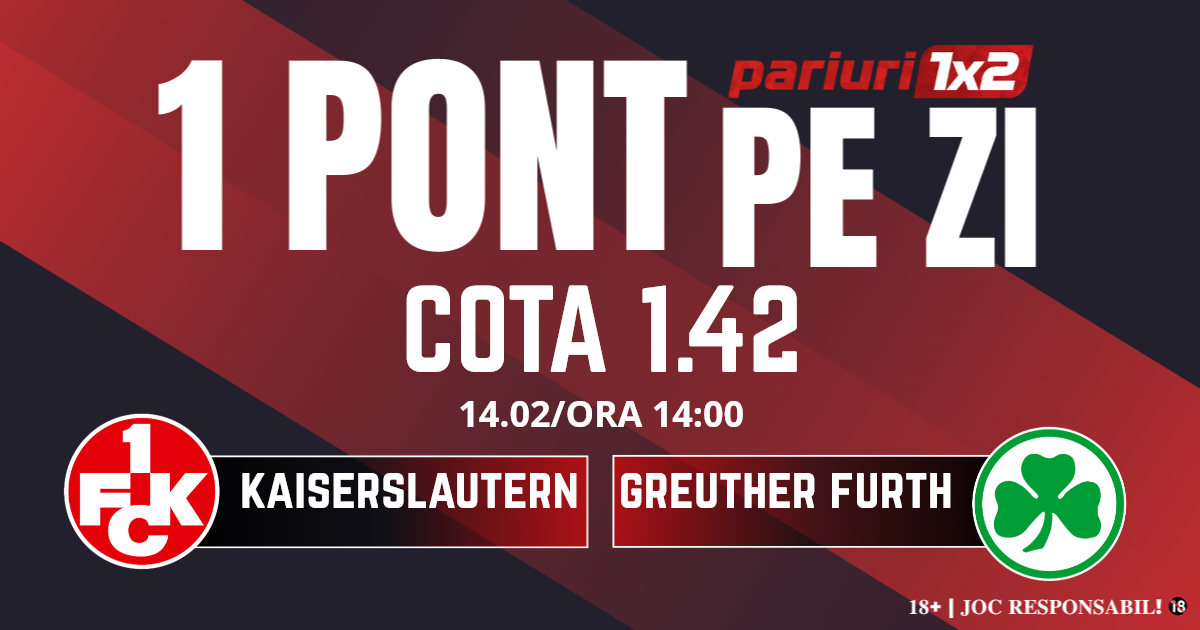 Pentru rubrica Un Pont pe Zi mergem la meciul dintre Kaiserslautern și Greuther Furth, partidă contând pentru etapa cu numărul 22 din Zweite Bundesliga. Duelul dintre cele două formații va avea loc pe Fritz Walter Stadion, începând cu ora 14.00. Gazdele se află pe locul șapte cu 31 de puncte și ar cam fi ultima șansă de a reintra în lupta pentru promovarea în Bundesliga. „Diavolii roșii” sunt deja la 8 lungimi de poziția de baraj, iar în ultimele trei runde nu au nici un succes.  De partea cealaltă, oaspeții sunt pe ultimul loc cu 19 puncte și încep să se distanțeze de celelalte formații. Pericolul retrogradării este real, iar fanii fostei prim divizionare sunt exasperați de defensiva favoriților, 52 de goluri primite. Mizăm pe faptul că gruparea gazdă va cuceri toate puncte în această partidă, iar pronosticul nostru este 1x și peste 1.5 goluri.