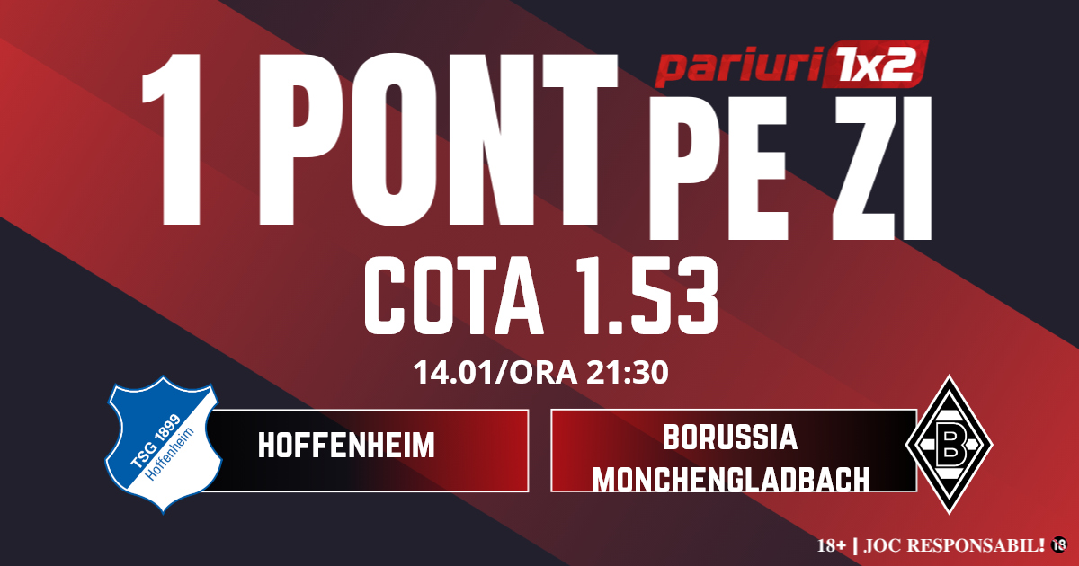 Pentru rubrica Un Pont pe Zi mergem la meciul dintre Hoffenheim și Borussia Monchengladbach, partidă contând pentru etapa cu numărul 17 din Bundesliga. Duelul dintre cele două formații va avea loc pe PreZero Arena din Sinsheim, începând cu ora 21.30. Gazdele nu au jucat în prima rundă din acest an, meciul acestora fiind amânat din cauza condițiilor meteo nefavorabile. Hoffenheim face un sezon neașteptat de bun, având șanse chiar la ocuparea unui loc în top patru. Atacul este unul foarte productiv, 29 de goluri marcate. De partea cealalată, Gladbach vine după o victorie clară, 4-0 contra celor de la Augsburg și s-a depărtat de zona roșie a clasamentului. Oaspeții au compensat problemele mari din apărare cu un atac eficient, 22 de goluri marcate. În ultimele 11 întâlniri directe, ambele echipe au înscris de fiecare dată. De altfel, în precedenta confruntare dintre cele două formații, scorul a fost unul spectaculos, 4-4. Mizăm pe un duel în care se va marca mult, iar pronosticul nostru este „ambele înscriu”.
