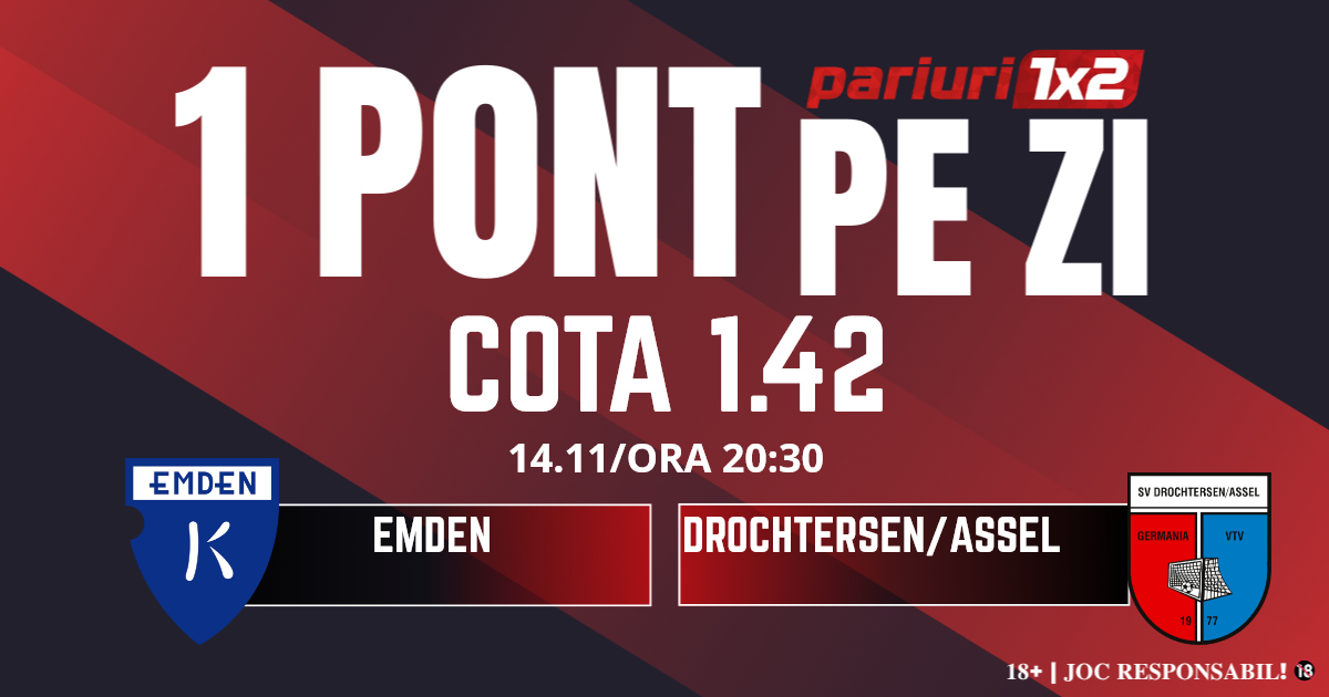 Pentru rubrica Un Pont pe Zi mergem la meciul dintre Emden și Drochtersen/Assel, partidă contând pentru etapa cu numărul 19 din Regionalliga Nord, una din seriile eșalonului patru din fotbalul german. Duelul dintre cele două formații va avea loc pe Ostfriesland-Stadion începând cu ora 20.30. Gazdele se află pe locul 14 cu 20 de puncte acumulate, fiind situate imediat deasupra liniei roșii a retrogradării. Lupta pentru supraviețuire se anunță una foarte dificilă, mai ales că Emden are doar un singur succes în precedentele cinci partide. De remarcat fotbalul deschis pe care îl practică gruparea de pe Ostfriesland, 31 de goluri marcate și 32 de goluri primite. De partea cealaltă, Drochtersen/Assel este liderul la zi de seria de nord a ligii a -4a germane cu 42 de puncte. Bilanțul este de 14 victorii și patru înfrângero, oaspeții fiind singura formație fără nici un rezultat de egalitate. Ocupanta primului loc joacă foarte ofensiv, 51 de goluri marcate și 25 de goluri primite. Ne așteptăm la un meci spectaculos, iar pronosticul nostru este peste 2.5 goluri.