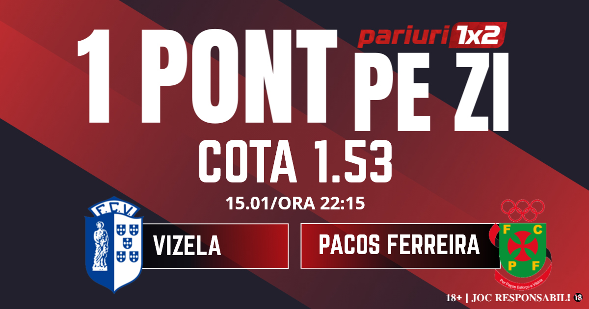 Pentru rubrica Un Pont pe Zi mergem la meciul dintre Vizela și Pacos Ferreira, partidă contând pentru etapa cu numărul 18 din Liga Portugal 2. Duelul dintre cele două formații va avea loc pe Estádio do Vizela, începând cu ora 22.15.  Gazdele vin după o înfrângere surprinzătoare, 0-1 pe teren propriu cu Torreense, o formație care avea cinci eșecuri consecutive. Vizela a pierdut trei puncte extrem de importante în economia campionatului.  Formația gazdă are probleme în atac, doar 19 goluri marcate și se află pe locul șase cu 24 de puncte. De partea cealaltă, Pacos Ferreira este în pericol de retrogradare în eșalonul trei al fotbalului portughez. Cu 19 puncte acumualte, oaspeții  sunt la egalitate de puncte cu prima formație aflată sub linia roșie, Penafiel. Mizăm pe un meci în care nici una dintre cele două formații nu se va mulțumi cu un punct, iar pronosticul nostru este 2-4 goluri.