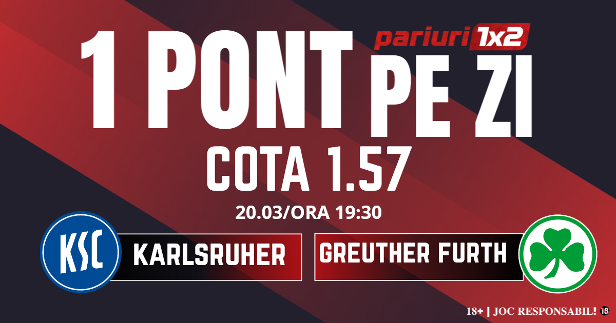 Pentru rubrica Un Pont pe Zi mergem la meciul dintre Karlsruher și Greuther Furth, partidă contând pentru etapa cu numărul 27 din Zweite Bundesliga, al doilea eșalon al fotbalului din Germania. Duelul dintre cele două formații va avea loc pe BBBank Wildpark, începând cu ora 19.30.  Gazdele vin după o înfrângere clară, 0-3 în derby-ul cu FC Kaiserslautern, dar nu au emoții cu lupta pentru evitarea retrogradării. Karlsruher se află pe locul 8 cu 34 de puncte, iar apărarea este una foarte slabă, 50 de goluri primite. De partea cealaltă, oaspeții și-au făcut un lot bun în acest an, iar cu ultimele două succese au reușit să iasă din zona roșie a clasamentului. Furth se află într-o formă foarte bună, trei victorii și o remiză în precedentele patru runde. Mizăm pe un meci bun făcut de oaspeți, iar pronosticul nostru este Furth marchează 1-2 goluri.