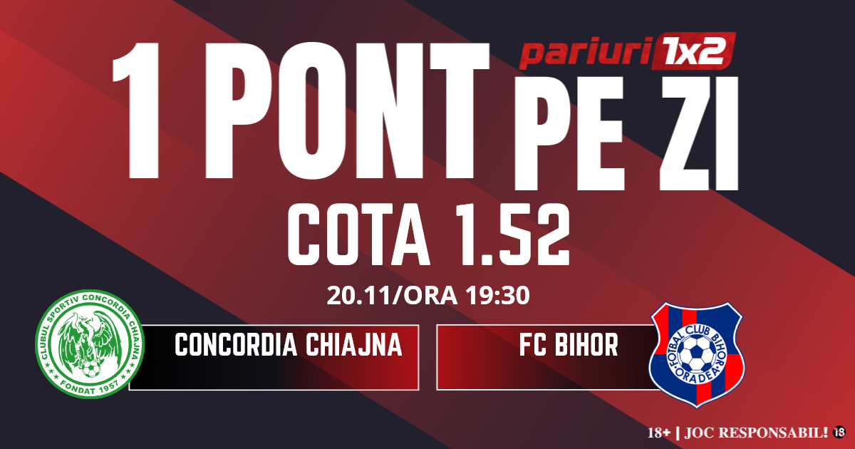 Pentru rubrica Un Pont pe Zi mergem la meciul dintre Concordia Chiajna și FC Bihor, partidă contând pentru etapa cu numărul 14 din eșalonul secund al fotbalului românesc. Duelul dintre cele două formații va avea loc pe Stadionul Concordia de la ora 19.30. Gazdele se află abia pe locul 11 cu 20 de puncte acumulate, la cinci puncte de un loc de play off. Ilfovenii își doresc revenirea în Superliga după retrogradarea din 2019, dar misiunea se anunță una foarte grea. În precedentele trei runde, elevii lui Andrei Cristea au două înfrângeri. De partea cealaltă, bihorenii se luptă cu șanse reale la promovarea în Superliga. Oaspeții se află pe locul trei cu 26 de puncte acumulate, dar încă nu au asigurată matematic poziția de play off. Ardenelenii joacă bine sub comanda lui Erik Lincar, având doar trei înfrângeri în 13 meciuri. Mizăm pe faptul că oaspeții vor face o partidă bună în care vor reuși să obțină cel puțin un punct.