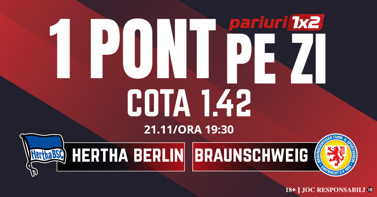 Pentru rubrica Un Pont pe Zi mergem la meciul dintre Hertha Berlin și Braunschweig, partidă contând pentru etapa cu numărul 13 din Zweite Bundesliga. Duelul dintre cele două formații va avea loc pe Olympiastadion din Berlin, începând cu ora 19.30. Gazdele se află pe locul 8 cu 20 de puncte acumulate, fiind la doar trei lungimi de poziția a 3-a, cea care duce la barajul de promovare. De altfel, obiectivul echipei din capitala Germaniei este clar, revenirea în Bundesliga. Se anunță însă un sezon foarte greu, în această luptă fiind implicate cel puțin încă șase echipe. De partea cealaltă, Braunschweig are viață grea în ceea ce privește menținerea în Zweite Bundesliga. Oaspeții se află pe locul 16 cu doar zece puncte acumulate. Forma sportivă este una foarte slabă, patru înfrângeri și o victorie în ultimele cinci runde. Mizăm pe gazde în această întâlnire, iar pronosticul nostru este 1x și peste 1.5 goluri.