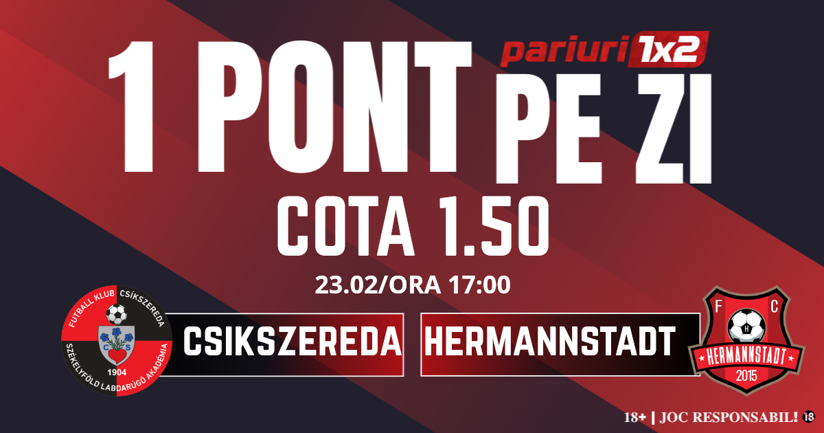Pentru rubrica Un Pont pe Zi mergem la meciul dintre Csikszereda  și Hermannstadt, partidă contând pentru etapa cu numărul 28 din Superliga. Duelul dintre cele două formații va avea loc pe Stadionul Municipal din Miercurea Ciuc, începând cu ora 17.00. Gazdele se află pe locul 13 cu 25 de puncte, iar în ultimele cinci etape au obținut două victorii. Elevii lui Ilyes se vor lupta pentru menținerea în Superliga, lupta fiind una extrem de strânsă. De partea cealaltă, Sibiul este într-o situație dramatică. Cu doar 17 puncte acumulate, formația sibiană se află pe locul 15 și nu are voie să piardă în această deplasare. În cazul unei înfrângeri, elevii lui Dorinel Munteanu se vor îndepărta de restul plutonului și vor avea o misiune imposibilă chiar și la înjumătățire. Astfel, ne așteptăm la un meci echilibrat, iar pronosticul nostru este „x sau sub 2.5 goluri”.