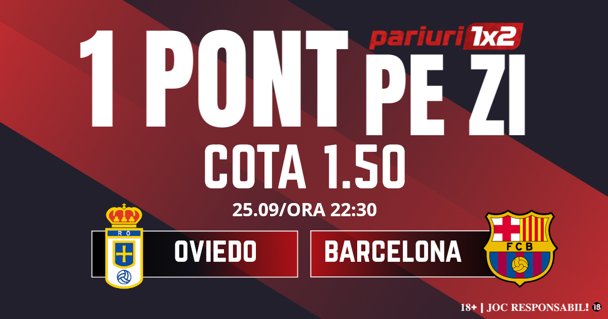 Pentru rubrica Un Pont pe Zi mergem la meciul dintre Oviedo și Barcelona, meci contând pentru etapa cu numărul șase din La Liga. Duelul dintre cele două formații va avea loc pe Estadio Nuevo Carlos Tartiere din Oviedo, începând cu ora 22.30. Gazdele au revenit după mulți ani în primul eșalon al fotbalului spaniol dar impactul a fost dur. Fosta formație a lui Marius Lăcătuș este pe locul 18 cu o victorie și patru eșecuri în cele cinci meciuri disputate. Mai mult, gazdele au un singur gol marcat. De partea cealaltă, Barcelona are nevoie de victorie pentru a menține ritmul cu Real Madrid, ocupanta primului loc. O singură sincopă au avut catalanii în La Liga, 1-1 cu Rayo Vallecano. Mizăm pe un meci în care elevii lui Hansi Flick nu vor avea probleme majore, iar pronosticul nostru este Barcelona marchează 2-4 goluri.
