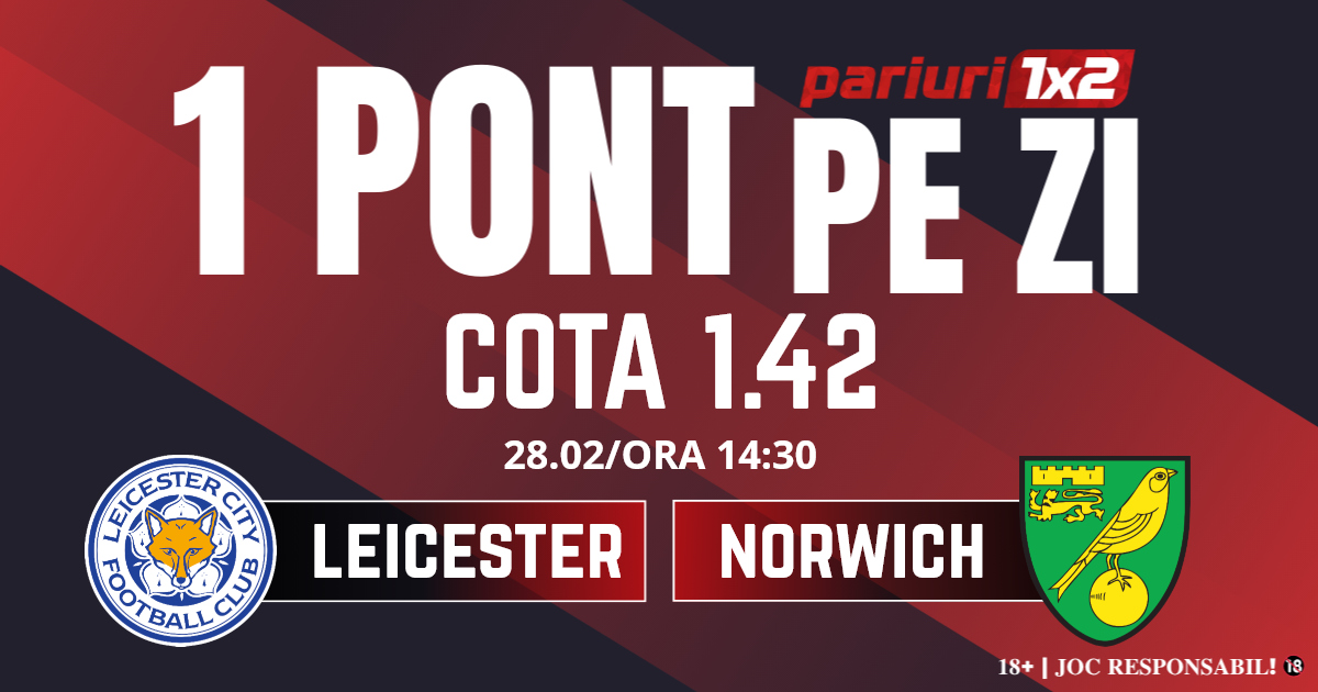 Pentru rubrica Un Pont pe Zi mergem la meciul dintre Leicester și Norwich, partidă contând pentru etapa cu numărul 35 din Championship. Duelul dintre cele două formații va avea loc pe King Power Stadium, începând cu ora 14.30. Gazdele sunt într-o situație dramatică, fiind clasate pe locul 22 cu 34 de puncte. Dintr-o candidată certă la revenirea în Premier League, Leicester s-a transformat într-o echipă mediocră, aflată în pericol de retrogradarea în League One. Forma grupării de pe King Power Stadium este una modestă, două remize și trei înfrângeri în ultimele cinci meciuri. Dar rezultatul obținut în runde precedentă, 1-1 pe terenul celor de la Middlesbrough este unul încurajator. Oaspeții s-au depărtat ușor, ușor de zona periculoasă, după ce la un moment dat erau pe poziții retrogradabile. Mizăm pe gazde în această partidă, iar pronosticul nostru este „1x”.