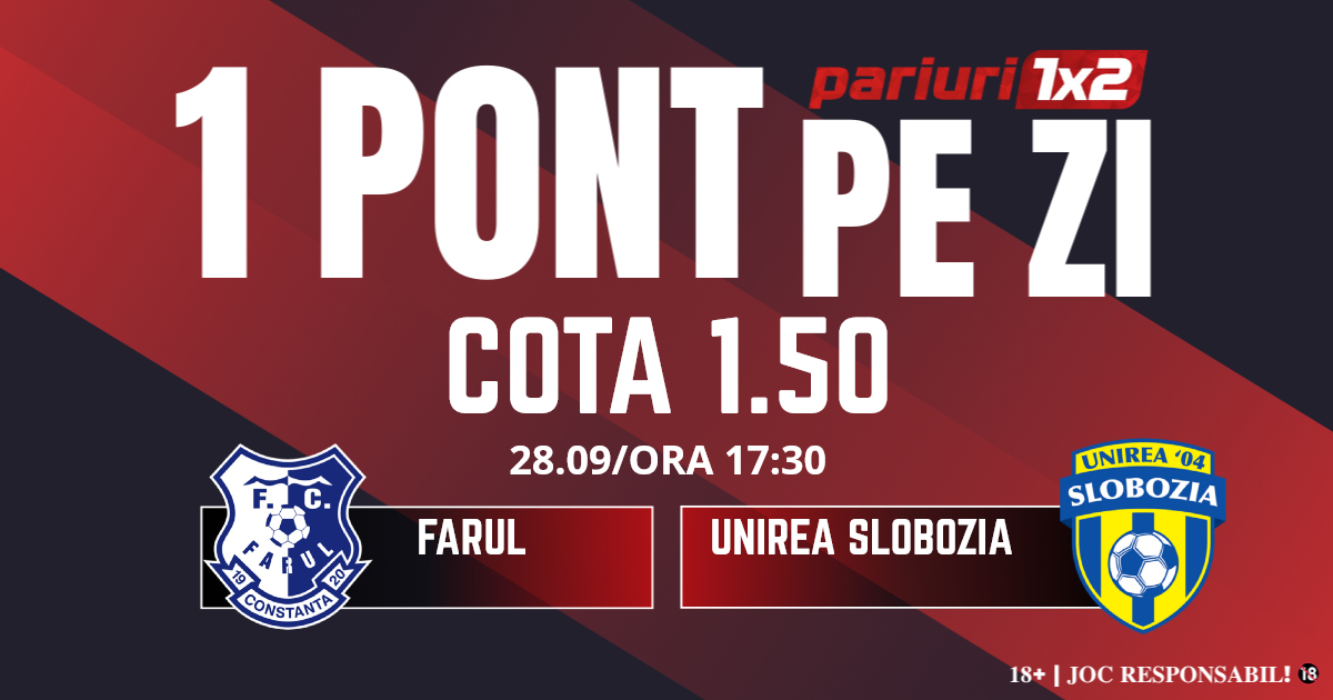 Pentru rubrica Un Pont pe Zi mergem la meciul dintre Farul și Unirea Slobozia, meci contând pentru etapa cu numărul 11 din Superliga. Duelul dintre cele două formații va avea loc pe Stadionul din Ovidiu începând cu ora 17.30. Gazdele nu sunt în cea mai bună formă, o singură victorie în ultimele șase meciuri din campionat. Elevii lui Ianis Zicu au nevoie de victorie pentru a nu pierde contactul cu echipele din față. De partea cealaltă, Slobozia este revelația acestui campionat. Formația antrenată de Andrei Prepeliță a acumulat deja 17 puncte deși la începutul sezonului toți o vedeau retorgradată. Ne așteptăm la un meci în care gazdele să nu piardă, iar pronosticul nostru este 1x și 1-4 goluri.