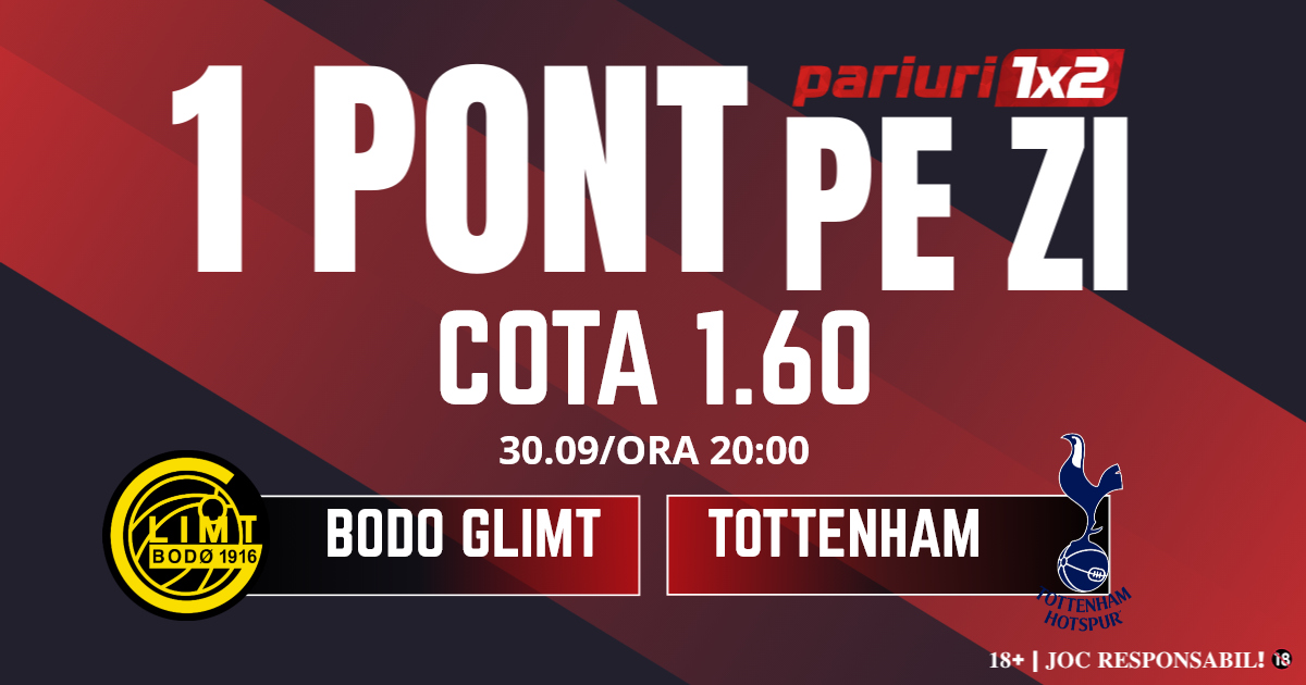 Pentru rubrica Un Pont pe Zi mergem la meciul dintre Bodo Glimt și Tottenham, meci contând pentru etapa cu numărul doi din Liga Campionilor. Duelul dintre cele două formații va avea loc pe Aspmyra Stadion din Bodø, începând cu ora 22.00.  Gazdele se află în formă bună, în ultimele cinci partide înregistrând trei victorii și două remize. Nici englezii nu o duc rău, având același bilanț în precedentele cinci partide ca și adversara din acest meci. Cele două formații s-au întâlnit și în semifinalele Europa Leaue din sezonul trecut. Atunci, Tottenham a învins, 0-2 în Norvegia și 3-1 pe teren propriu. Ne așteptăm la un meci spectaculos, cu multe reușite iar pronosticul nostru este peste 2.5 goluri.