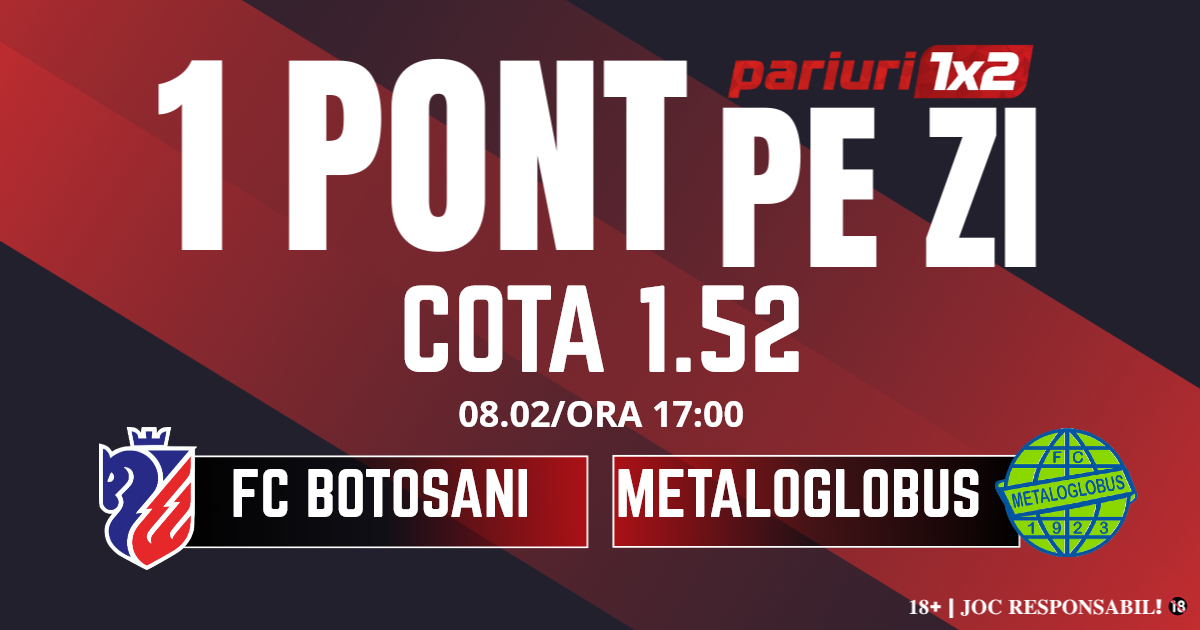 Pentru rubrica Un Pont pe Zi mergem la meciul dintre FC Botoșani și Metaloglobus, partidă contând pentru etapa cu numărul 26 din Superliga. Duelul dintre cele două formații va avea loc pe Stadionul Municipal, începând cu ora 17.00.  Gazdele vin după o serie de zece meciuri în care au obținut doar un succes, iar victoria a devenit cuvântul de ordine în vestiarul botoșănenilor. Pentru a mai avea șanse la play off, elevii lui Leo Grozavu nu concep să se împiedice de ultima clasată, Metaloglobus vine după șase înfrângeri consecutive, iar șansele de salvare de la retrogradare sunt infime. Mizăm pe un meci bun făcut de moldoveni mai ales că runda precedentă au marcat și primul gol, după o secetă de aproape 700 de minute. Astfel, pronosticul nostru este 1 și peste 1.5 goluri.
