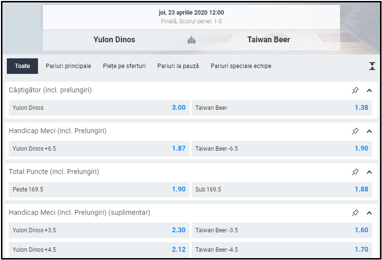 Taiwan Beer are sase victorii si un singur esec in al doilea tur din sezonul regulat, in timp ce Dinos au un bilant negativ pe teren propriu, trei victorii si cinci infrangeri. Mizam pe regruparea celor de la Taiwan Beer si pe un succes obtinut la o diferenta de minim patru puncte.