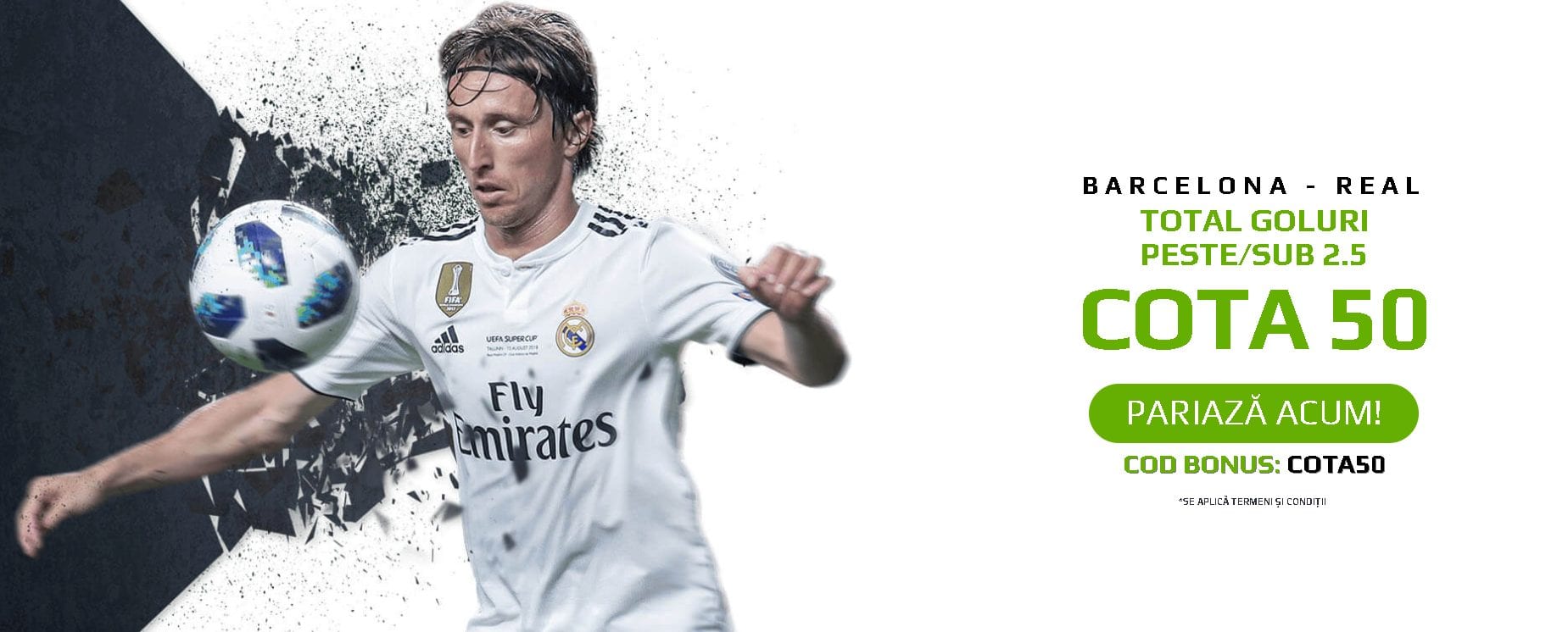 - Plasează primul tău pariu pe TOTAL GOLURI: PESTE/SUB din meciul Barcelona vs Real Madrid, din 28 Octombrie ora18:15. Daca ai urmat pasii de mai sus, varianta selectata de tine va avea COTA 50!