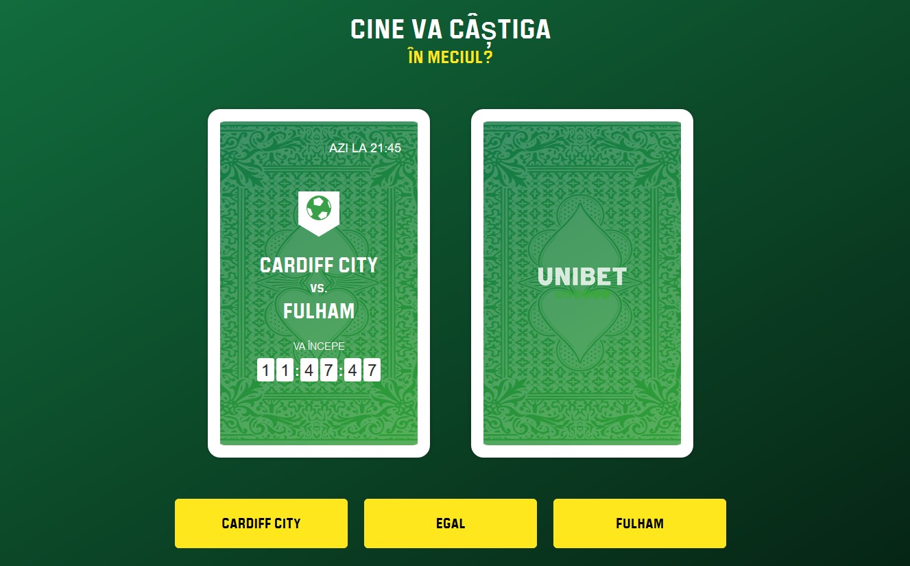 Concursul Bounce de la Unibet continua gratuit pana pe data de 30 iulie. Astazi, o noua intrebare: Cine va castiga meciul Cardiff – Fulham, programat  de la ora 21:45. Raspunde corect si castiga pariuri gratuite de 10 , 50, 100 si 150 RON, alaturi de rotiri gratuite in popularul slot Shining Crown.  Ataca premiul cel mare in valoare de 7.500 RON cash!