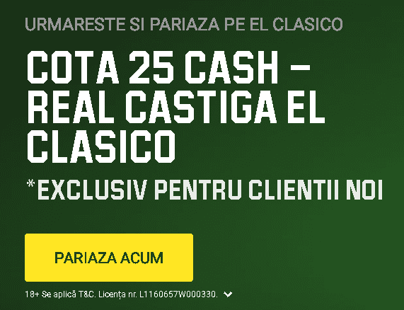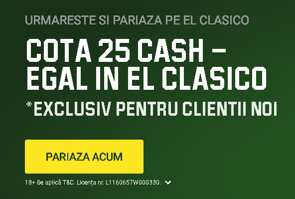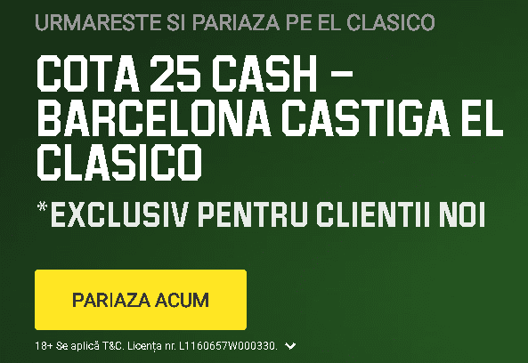 Pentru primul El Clasico al sezonului, Unibet aduce o oferta speciala de achizitie clientilor noi. Este vorba despre o cota marita de 25 pentru orice pronostic 1 X 2 la Barcelona – Real. Cota este cash, insemnand ca profitul poate fi retras fara conditii de rulaj. Miza maxima este 10 RON iar castigul maxim 250 RON.
