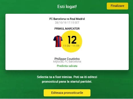 - Utilizatorii vor pronostica primul marcator al meciului si minutul in care acest prim gol va fi marcat (vezi poza de mai jos)