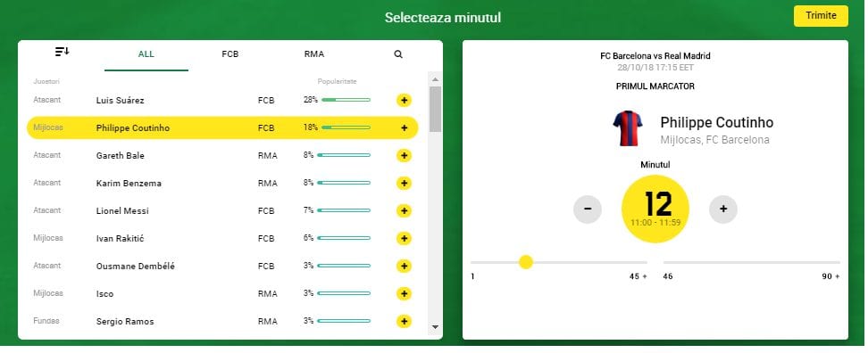 Din tabelul stanga se selecteaza marcatorul primului gol, iar din cel din dreapta, minutul golului. Apoi click pe trimite!