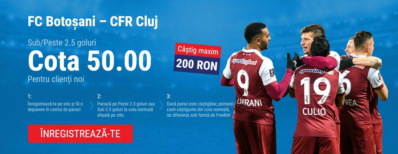 - Pentru a beneficia de cota 50 pentru pariul „Sub 2.5 goluri” sau pariul „Peste 2.5 goluri” trebuie să te înregistrezi înainte de startul meciului, să faci o depunere de cel putin 40 de lei în contul tău de pariuri și să plasezi un pariu simplu pre-meci (înainte de începutul meciului) pe piața „Câte goluri vor fi înscrise in FC Botosani – CFR Cluj?” – „Peste 2.5 goluri” sau „Sub 2.5 goluri”.