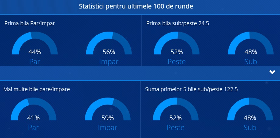 PublicWin pune la dispozitie jucatorilor o serie de statistici imperios necesare celor ce isi doresc sa obtina profit! PublicWin isi respecta clientii punandu-le la dispozitie statistici pentru ultimele 100 runde la LuckySix, in care pot fi urmarite cele mai extrase bile, cele mai putin extrase bile, culoarea primei bile, suma primelor 5 bile sau numarul primei bile.