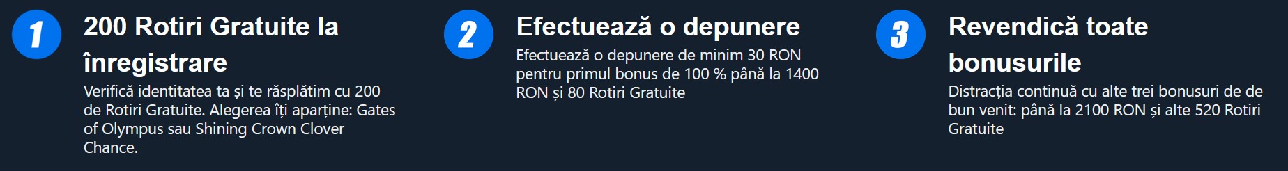 - Depune minim 100 RON și primești Bonus 50% până la 500 RON + 230 Rotiri Gratuite Gates of Olympus