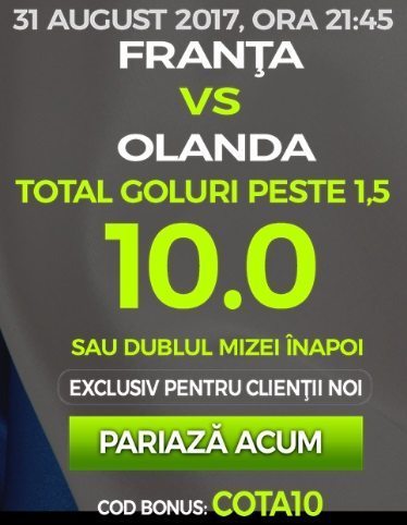 - Pariaza, la cota actuala, ca se vor inscrie peste 1.5 goluri in partida Franta – Olanda de astazi, ora 21:45. Poti paria orice suma, insa doar 40 de lei vor fi multiplicati cu cota marita.
