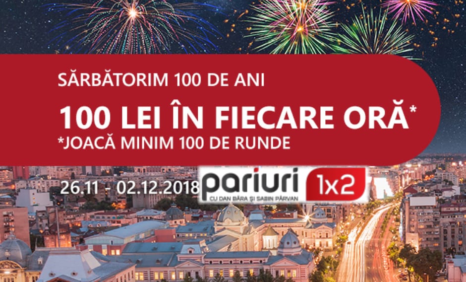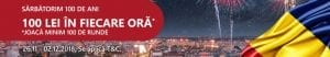 Sărbătoarea Centenarului României vine la Casinoul Casa Pariurilor cu 100 lei pe oră. Joacă in perioada 26.11.2018, ora 00:00 – 02.12.2018, ora 23:59 la oricare dintre jocurile de casino și poți intra în tragerea la sorți pentru câștigarea unuia dintre cele 168 de bonusuri, de 100 lei. Promoția se derulează în fiecare zi, pe întreaga perioadă a campaniei.