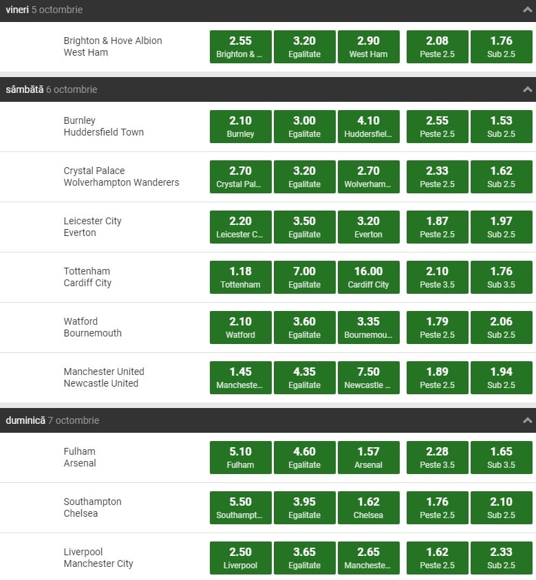 Cele doua formatii conduc clasamentul din Anglia si se lupta la golaveraj pentru suprematie, fiind alegerea unanima a caselor de pariuri in ceea ce priveste favoritele la titlu. Tot duminica joaca Chelsea la Southampton si Arsenal la Fulham, intr-un nou duel 100% londonez. Etapa este deschisa vineri, de duelul dintre Brighton si West Ham United.
