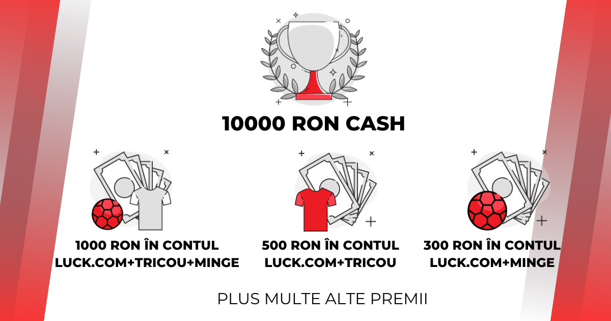 Dar câștigurile nu se opresc aici! Te invităm să fii parte din cursa jucătorilor, unde ai premii garantate pentru clasamentul TOP 20. De la tricouri și mingi de colecție, până la sume de până la 2500 DE LEI în contul Luck, avem o mulțime de recompense pregătite special pentru tine. Fiecare pas pe care îl faci în această cursă te apropie mai mult de victorie și de premiile fabuloase care îți vor transforma experiența într-un adevărat triumf.