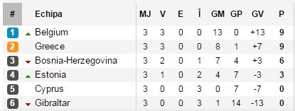 Inca din startul campaniei, situatia se prezinta destul de clar in grupa H. Belgia, Grecia si Bosnia sunt nationalele ce vor lupta pentru primele doua locuri, Estonia, Cipru si Gibraltar fiind reprezentativele ce vor incerca sa joace, fara prea mult succes, rolul buturugilor mici. Toate cele 3 jocuri ale etapei cu numarul 4 se vor disputa duminica.