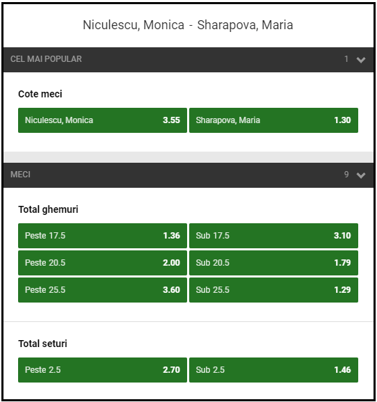 3.55 a fost cota oferita de Unibet pentru un succes obtinut de Niculescu in aceasta confruntare. Pontul oferit de redactia noastra a fost si el castigatot, minim un set castigat de jucatoarea din Romania.