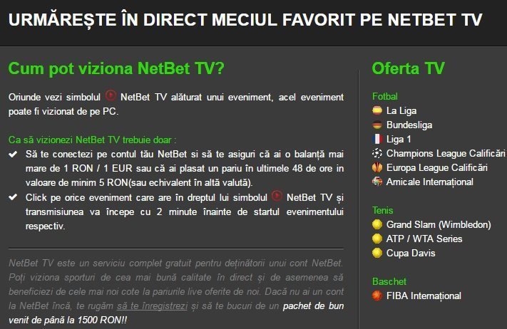 Pentru a nu fi nevoiti sa fim conectati la 2-3 firme de cablu pentru a urmari cele mai tari transmisiuni sportive, avem la indemana o alternativa extrem de simpla si ieftina. Este vorba de revolutionara platforma NetBet TV, prin intermediul careia avem acces zilnic la zeci de meciuri din toate sporturile transmise LIVE VIDEO.