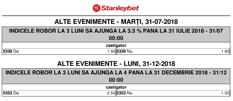 Indicele ROBOR devenit subiect de pariuri. Agentia Stanleybet este prima din Romania care introduce in oferta pariurile speciale ce privesc nivelul ROBOR la 3 luni si valoarea acestuia pe 31 iulie si la finalul anului 2018.