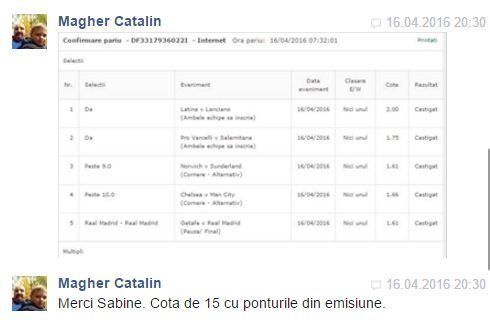 Catalin a mizat pe cornere in Norwich – Sunderland si Chelsea – Man. City, precum si pe pariurile ambele marcheaza la disputele din Serie B, Pro Vercelli – Salernitana si Latina – Lanciano. A incheiat biletul cu un logic 2 pauza/2 final in Getafe – Real Madrid. Catalin nu a vrut sa se laude cu castigul net adus de combo-ul sau, insa suntem convinsi ca, la o cota de 15, acesta a fost unul consistent!