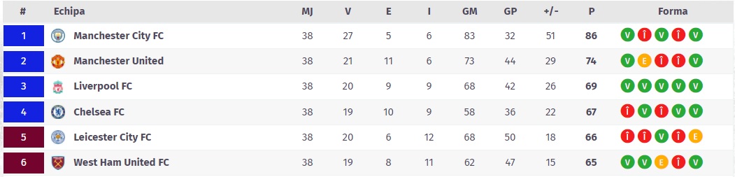 Manchester United a „trait” mai mult din executiile lui Bruno Fernandes si Marcus Rashford, iar trupa lui Solskjaer si-a asigurat fara probleme locul 2, desi a avut o defensiva ezitanta, care a comis multe erori pe tot parcursul sezonului. Liverpool a fost „macinata” de accidentari si a avut un sezon catastrofal, dar a incheiat stagiunea cu 5 victorii la rand, suficiente pentru un loc pe podium! Chelsea a prins in-extremis locul 4, iar marii perdanti au fost cei la Leicester. „Imbatati” de succesul din Cupa Angliei, elevii lui Brendan Rodgers au luat doar patru puncte in ultimele cinci etape si au coborat pe pozitia a 5-a, in ultima runda. Asadar, cvartetul fruntas a refuzat „surprizele” Leicester si West Ham, intr-un sezon in care Tottenham si Arsenal au dezamagit crunt, chiar daca Spurs l-a avut pe golgheterul Kane (23).