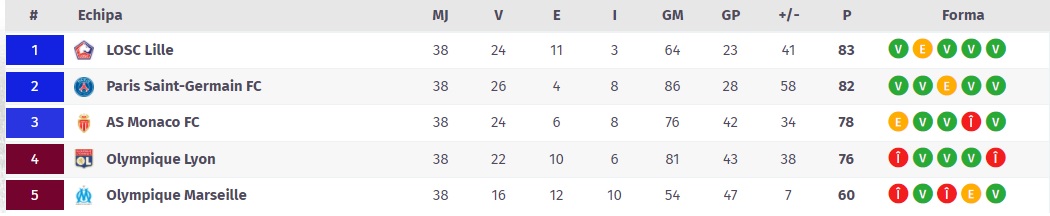 Lille a reusit un sezon de exceptie, in care a pierdut doar trei etape din 38, avand cea mai buna defensiva din Franta! Echipa lui Christophe Galtier, care o va parasi pe Lille pentru a semna cu Nice (!), a reusit un titlu nesperat in fata multimilionarilor de la PSG, care degeaba au avut cel mai bun atac din Ligue 1. Mbappe, Neymar si Kean n-au fost suficienti pentru asigurarea locului 1, fiindca Lille a surprins pe toata lumea cu un golgheter neasteptat – turul Burak Yilmaz (35 de ani), adus gratis la club (marcator a 15 goluri).
