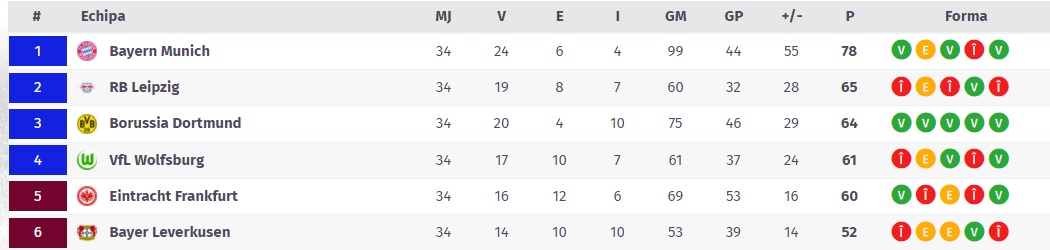 Pe 3 a terminat Borussia Dortmund, singura care a reusit sa „lege” 5 victorii consecutive in ultimele 5 etape din Germania. Haaland, Reus, Sancho si Bellingham au fost cei mai buni jucatori ai „galben-negrilor”. Pe 4 au terminat, surprinzator, „lupii” de la Wolfsburg, condusi din teren de Wout Weghorst si de pe banca de Oliver Glasner. Eintracht Frankfurt a avut un singur succes in ultimele patru etape si a scapat clasarea in Top 4 si, implicit, calificarea in editia viitoare a Ligii Campionilor.