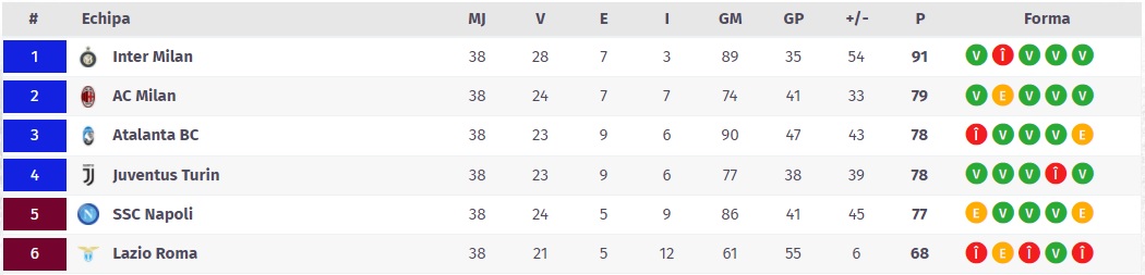 Nimeni nu i-a putut tine piept lui Inter Milano, care a pierdut doar 3 partide pe tot parcursul sezonului! Echipa lui Antonio Conte a excelat in talent ofensiv, gratie lui Eriksen, Hakimi, Martinez si Lukaku. Desi s-a aflat la un moment dat pe primul loc, AC Milan n-a reusit sa tina pasul, mai ales ca nici nu l-a avut la dispozitie pe Zlatan Ibrahimovic o buna parte din sezon. Totusi, Brahim Diaz si Ante Rebic au asigurat patru victorii si o remiza in ultimele cinci etape, sinonime cu locul 2. Doar doua puncte au despartit echipele de la locul 2 la locul 5!