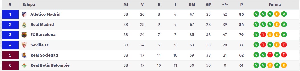 Atletico Madrid a fost marea castigatoare a sezonului, dupa ce l-a achizitionat la pret de „sold” pe Luis Suarez, „artizanul” unui titlu nesperat! Din nou cu o defensiva solida si un spirit de lupta fabulos, echipa lui Diego Simeone a terminat sezonul cu 86 de puncte, peste Real Madrid (84) si Barcelona (79). Realul a luptat pana in ultima clipa si pe plan european, dar parcursul perfect din ultimele etape nu i-a fost suficient. Chiar daca a „dejucat” un program foarte dificil, Realul lui Zidane a asteptat in van pasul gresit al lui Atleti: in ultima etapa, alb-rosii au revenit de la 0-1 in fata lui Valladolid si au castigat datorita executiilor inspirate ale lui Suarez si Correa.