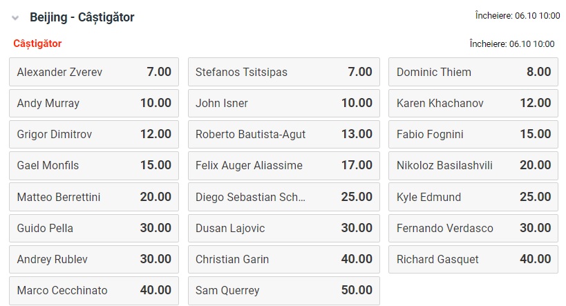 Andy Murray isi continua progresul in circuitul masculin. Britanicul va evolua la ATP Beijing, turneu de categoria 500, dupa eliminarea din optimile de finala de la Zhuhai, impotriva australianului Alex De Minaur. Dupa 2 victorii la Rafa Nadal Open si una la Zhuhai, Murray va ataca trofeul de la Beijing, unde are cota 10.00 sa il castige! Principalul favorit este insa germanul Alexander Zverev (cota 7.00), proaspat castigator al competitiei pe echipe Laver Cup, alaturi de „coechipierii” Stefanos Tsitsipas (cota 7.00) si Dominic Thiem (cota 8.00), prezenti si ei la Beijing. Cu aceeasi cota ca si Murray este americanul John Isner, ce a pierdut surprinzator la Chengdu cu bielorusul Egor Gerasimov. Intra pe site-ul casei de pariuri Betano, categoria Castigatori Competitie (sectiunea tenis) si pune-ti banii pe starurile tenisului mondial!