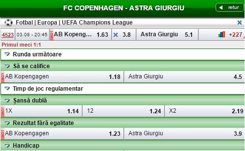 Casele de pariuri nu acorda prea multe sanse Astrei, cota propusa de Favbet pentru calificarea in play-off-ul Champions League fiind de 4,5, un succes al giurgiuvenilor in 90 de minute avand cota de 5,1.