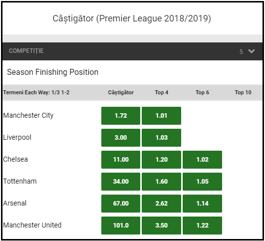 101 este in prezenta cota oferita de Unibet pentru ca Manchester United sa devina campioana in Premier League
